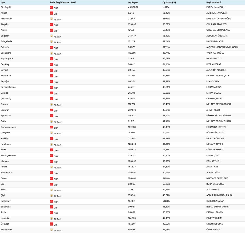 Örneğin İstanbul özelinde bakarsak, sadece CHP ve AKP %10’u geçmiş. Ancak MHP’nin de üyesi bulunuyor. Baraj ilçeler özelinde uygulanıyor dersek de bu üç parti dışında da üye olması gerekiyor (örneğin Sultanbeyli’de DEM ve BBP %10 üzerinde). Bu durumu açıklayabilirseniz çok memnun olurum ????